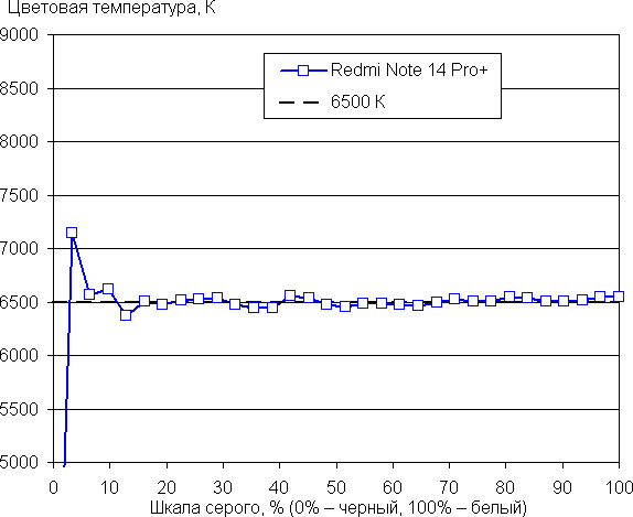 Однако после ручной коррекции (положение точки на цветовом круге как на снимке выше) удалось приблизить цветовую температуру к стандартным 6500 К, и сохранить отклонение от спектра абсолютно черного тела (ΔE) на низком значении. При этом цветовая температура и ΔE мало изменяются от оттенка к оттенку серого — это положительно сказывается на визуальной оценке цветового баланса. (Самые темные области шкалы серого можно не учитывать, так как там баланс цветов не имеет большого значения, да и погрешность измерений цветовых характеристик на низкой яркости большая.)