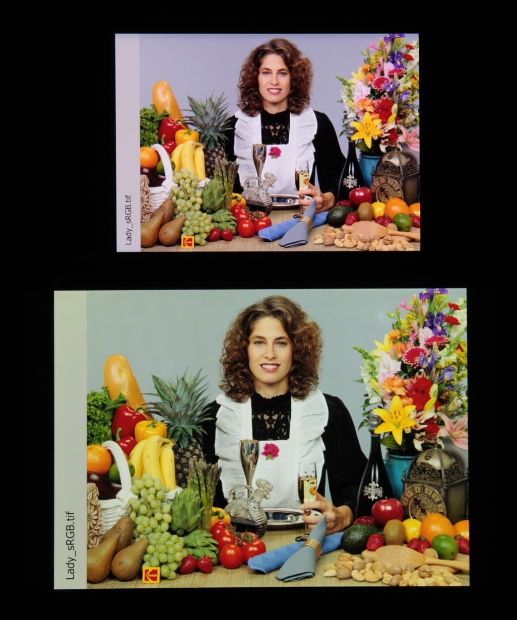 В случае изображения с профилем sRGB при выбранном профиле Vivid и при выводе в ПО Gallery, или в случае профиля Original Color Pro, или в случае профиля Advanced settings с выбранным охватом sRGB охват близок к sRGB: