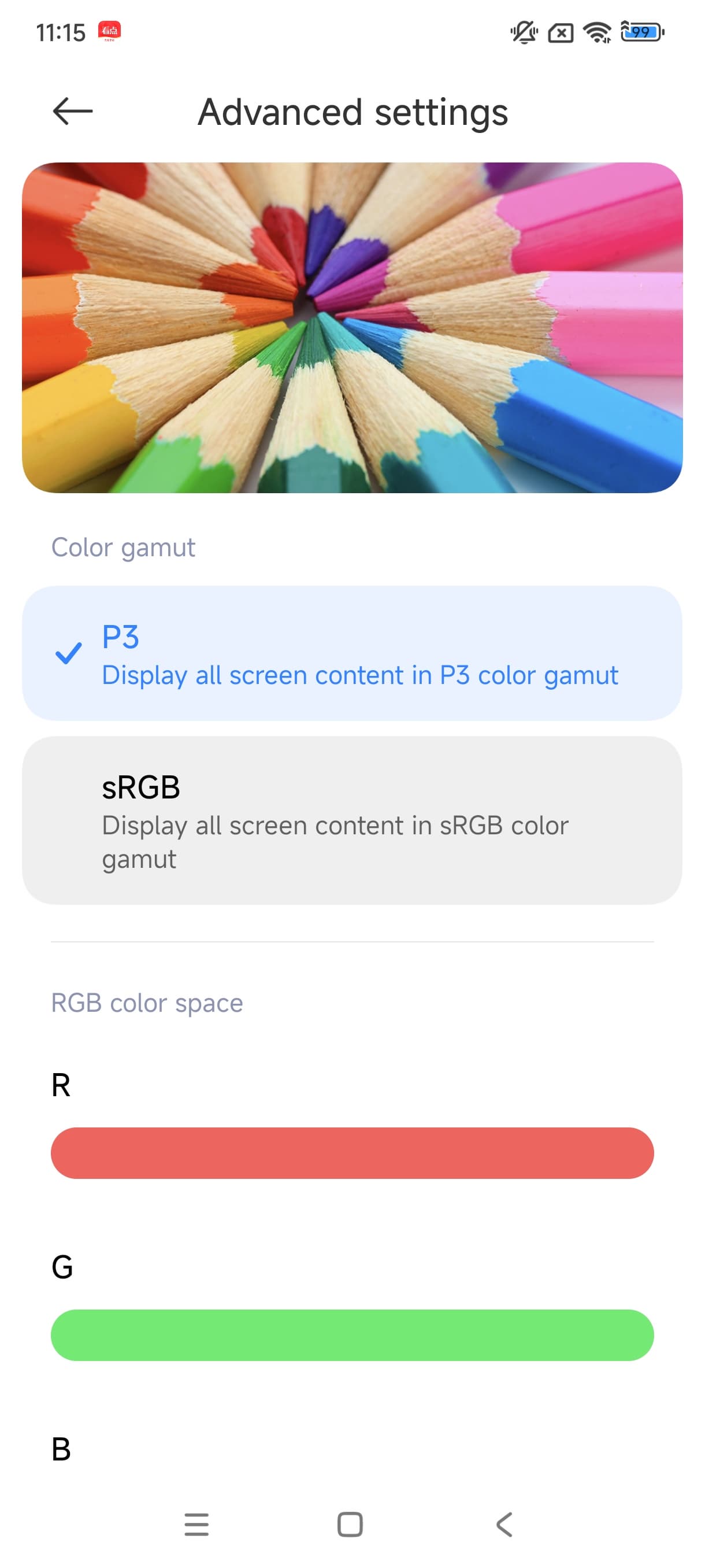 Цветовой охват зависит от выбранного профиля в настройках смартфона, от прописанного профиля в самом изображении, а также от программы, которая выводит изображение на экран смартфона. В случае профиля Vivid (он выбран по умолчанию) и при использовании штатной программы Gallery охват по возможности соответствует прописанному в изображении (если профиля в изображении нет, то считается, что оно соответствует sRGB), так как эта программа знает о возможностях экрана. Результат вывода в сторонних программах может отличаться от нужного, например, в случае Google Chrome изображения с профилем sRGB выводятся с охватом P3. Выбирая другие профили в настройках смартфона пользователь в явном или неявном виде сам выбирает цветовой охват, с которым будет выводится изображение, уже независимо от используемого ПО.
