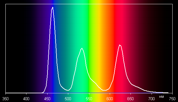 Спектры типичны для OLED — области первичных цветов хорошо разделены и имеют вид относительно узких пиков: