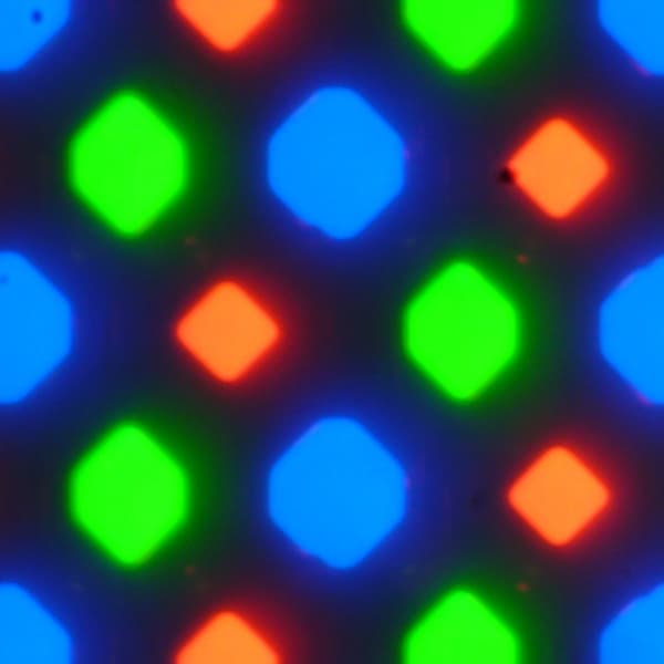 В этом экране используется OLED-матрица — активная матрица на органических светодиодах. Полноцветное изображение создается с помощью субпикселей трех цветов — красного (R), зеленого (G) и синего (B) в равном количестве, что подтверждается фрагментом микрофотографии:
