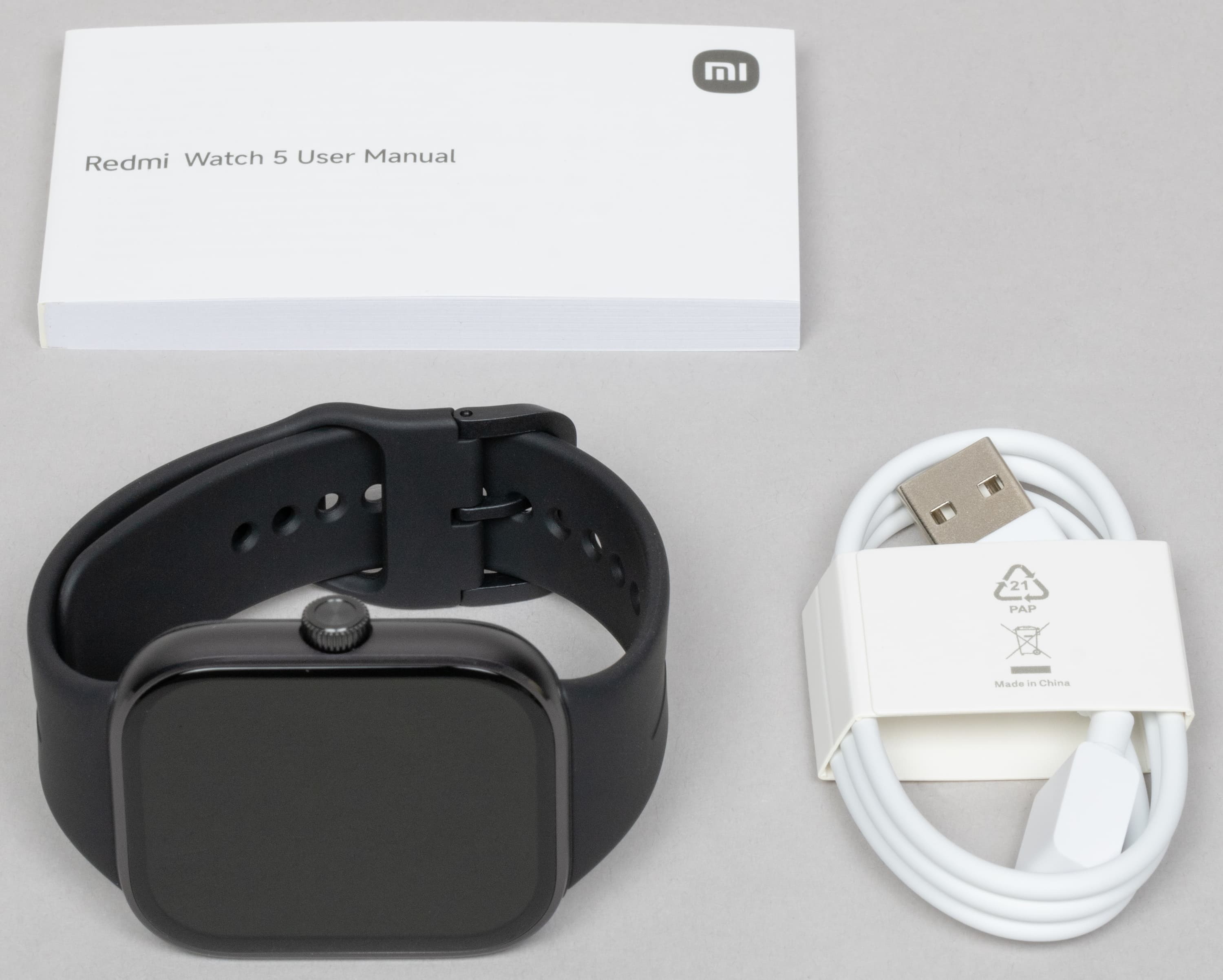 Комплектация минимальная: сами часы, кабель USB-A, присоединяемый к часам магнитным штекером с двумя контактами, и пухлый многоязычный буклет «Руководство пользователя».