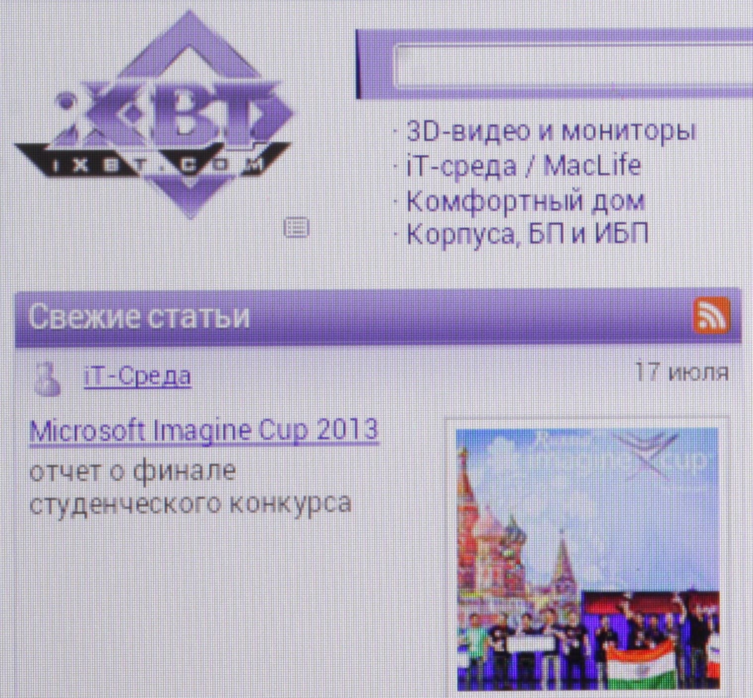 Собственно читаемость в условиях сильной засветки определяется не только тем, насколько подавляется отражение в экране, но и яркостью изображения. Чем ниже яркость отражения и выше яркость изображения, тем выше визуальный контраст и лучше читаемость. В следующем тесте мы оставили условия предыдущего теста, но включили устройства и вывели яркость их экранов на максимум. Читаемость в этих условиях можно оценить на фотографии ниже, где на экраны выводится заглавная страница нашего сайта: