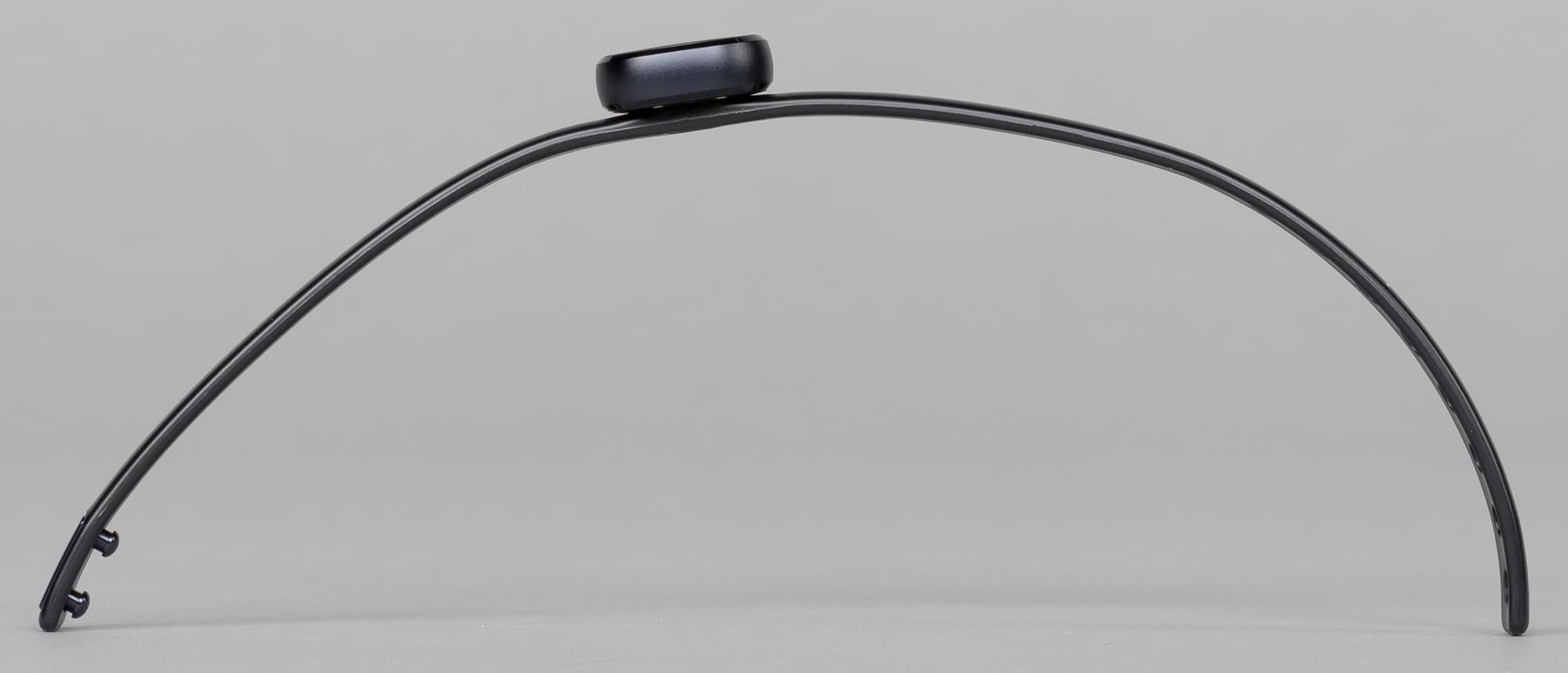 Боковые грани корпуса выполнены из металла, тыльная поверхность и крепление к ремешку — из пластика, а сверху — стекло с легким изгибом (что-то вроде модного в смартфонах 2,5D), благодаря чему браслет очень красиво бликует при попадании на него света. Это действительно радует и вызывает уважение к дизайнерам Samsung: если бы они вместо изогнутого стекла сделали здесь пластик или даже металл, устройство лишилось бы своего очарования. Впрочем, никакой функциональной нагрузки у стекла нет. Браслет лишен экрана и сенсорных функций, так что это решение — исключительно для красоты.