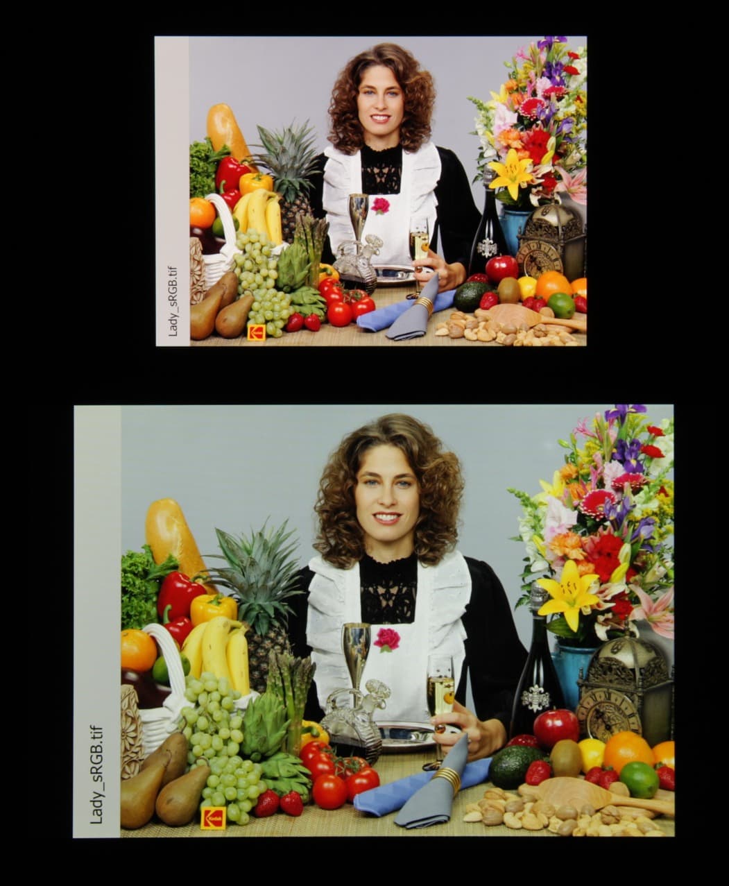 Отметим, что на экранах с широким цветовым охватом (без соответствующей коррекции) цвета́ обычных изображений, оптимизированных для устройств sRGB, выглядят неестественно насыщенными. Отсюда и рекомендация: в большинстве случаев смотреть кино, фотографии и все естественное лучше при выборе профиля Основной, и только если фотография сделана на установке Adobe RGB, имеет смысл переключить профиль на Фото AMOLED. Аналогично, профиль Фильм AMOLED уместен при просмотре видеоматериала с охватом DCI-P3, принятым в цифровом кинематографе.