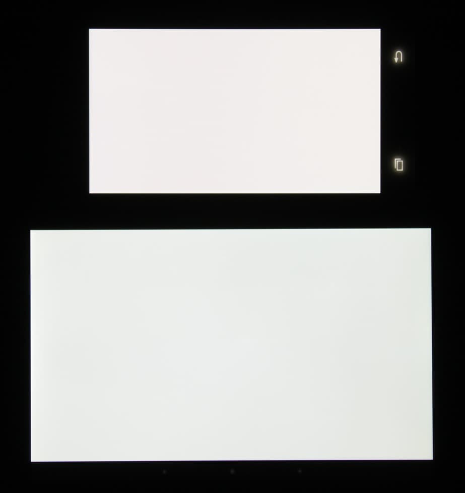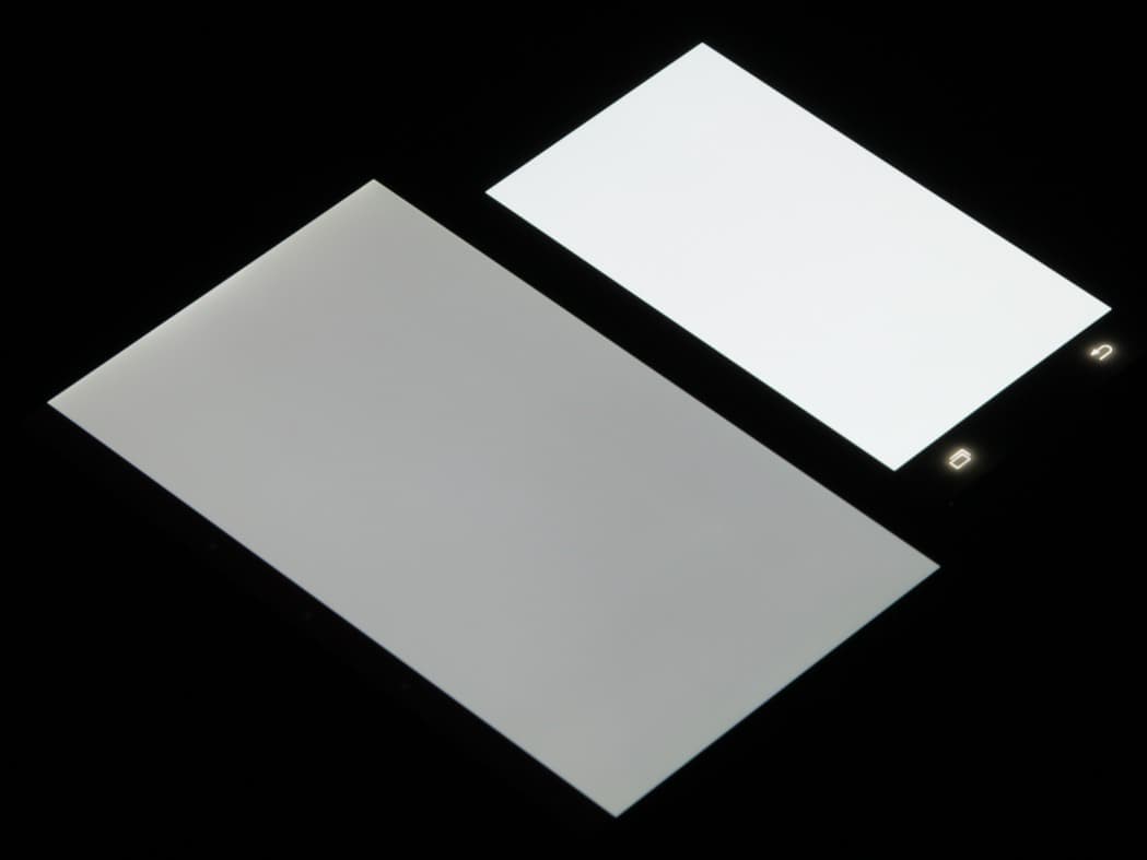 Экран характеризуется великолепными углами обзора, правда белый цвет при отклонении даже на небольшие углы приобретает легкий сине-зеленый оттенок, но черный цвет — просто черный под любыми углами. Настолько черный, что параметр контрастности в данном случае неприменим. При перпендикулярном взгляде равномерность белого поля отличная. Для сравнения приведем фотографии, на которых на экраны Samsung Galaxy A5 (профиль Основной) и второго участника сравнения выведены одинаковые изображения, при этом яркость экранов изначально установлена примерно на 200 кд/м², а цветовой баланс на фотоаппарате принудительно переключен на 6500 К. Белое поле: