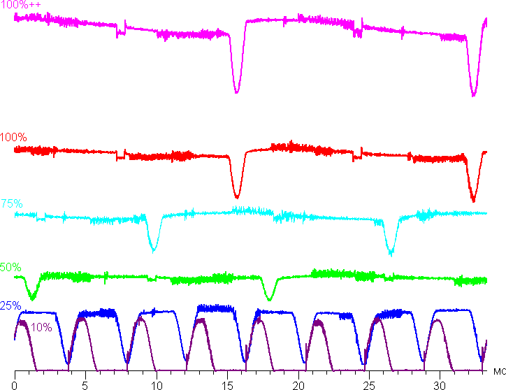 На любом уровне яркости присутствует значимая модуляция с частотой примерно 60 или 240 Гц. На рисунке ниже приведены зависимости яркости (вертикальная ось) от времени (горизонтальная ось) для нескольких значений настройки яркости (100%++ — это с дополнительной засветкой датчика освещенности ярким светом):