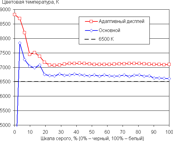 (Самые темные области шкалы серого в большинстве случаев можно не учитывать, так как там баланс цветов не имеет большого значения, да и погрешность измерений цветовых характеристик на низкой яркости большая.)