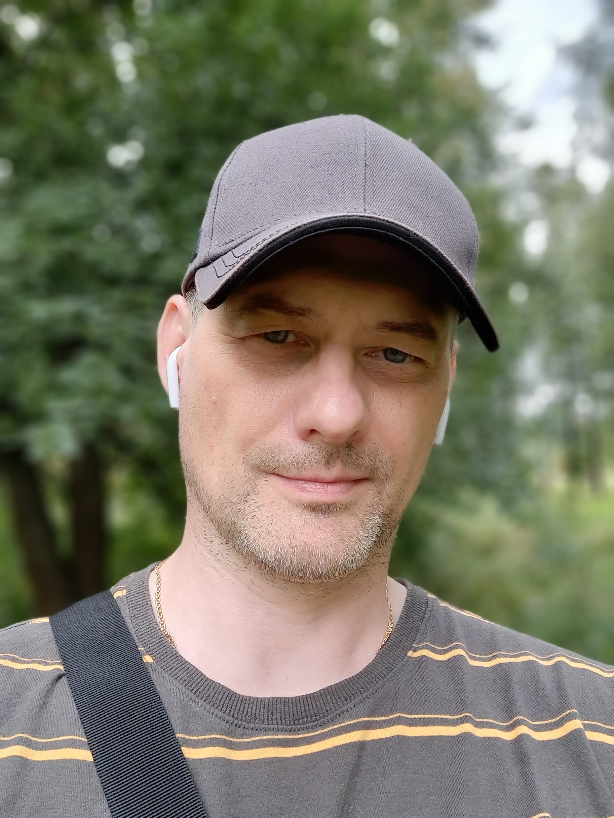 Селфи-камера здесь состоит из одного модуля (32 Мп, f/2.2, ЭФР 26 мм, 1/2.8″, 0.8 мкм), но предоставляет на выбор две картинки: нормальную, которую выдает за групповую, и кропнутую (8 Мп), которую предлагает в качестве основной. Впрочем, и «нормальная» делается по умолчанию в разрешении 12 Мп. В любом случае, съемка на фронтальную камеру удается смартфону не лучше, чем А41. Картинка четкая, но блеклая. Детализация не максимальна и есть недоэкспонированные участки, но для показа на экране самого смартфона и соцсетей — достаточно.