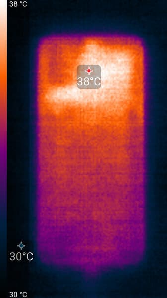 Нагрев выше в верхней части аппарата, что, видимо, соответствует расположению микросхемы SoC. По данным теплокамеры, максимальный нагрев составил 38 градусов (при температуре окружающего воздуха в 24 градуса), это не очень много.