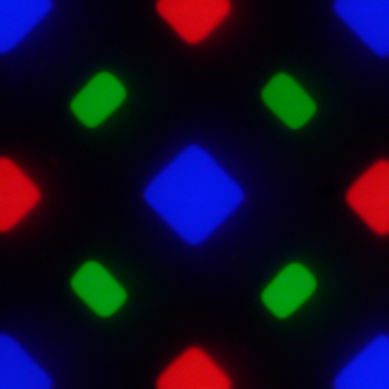 В этом экране используется матрица Super AMOLED — активная матрица на органических светодиодах. Полноцветное изображение создается с помощью субпикселей трех цветов — красного (R), зеленого (G) и синего (B), но красных и синих субпикселей в два раза меньше, что можно обозначить как RGBG. Это подтверждается фрагментом микрофотографии: