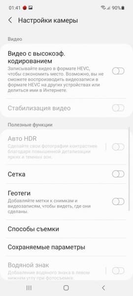 Интерфейс управления съемкой стандартный: есть Auto HDR, портретный, ночной режимы, фирменный мультикадр, отключаемая стабилизация, возможность съемки с функцией объединения 4 пикселей в один. Нет только возможности сохранять снимки в RAW.