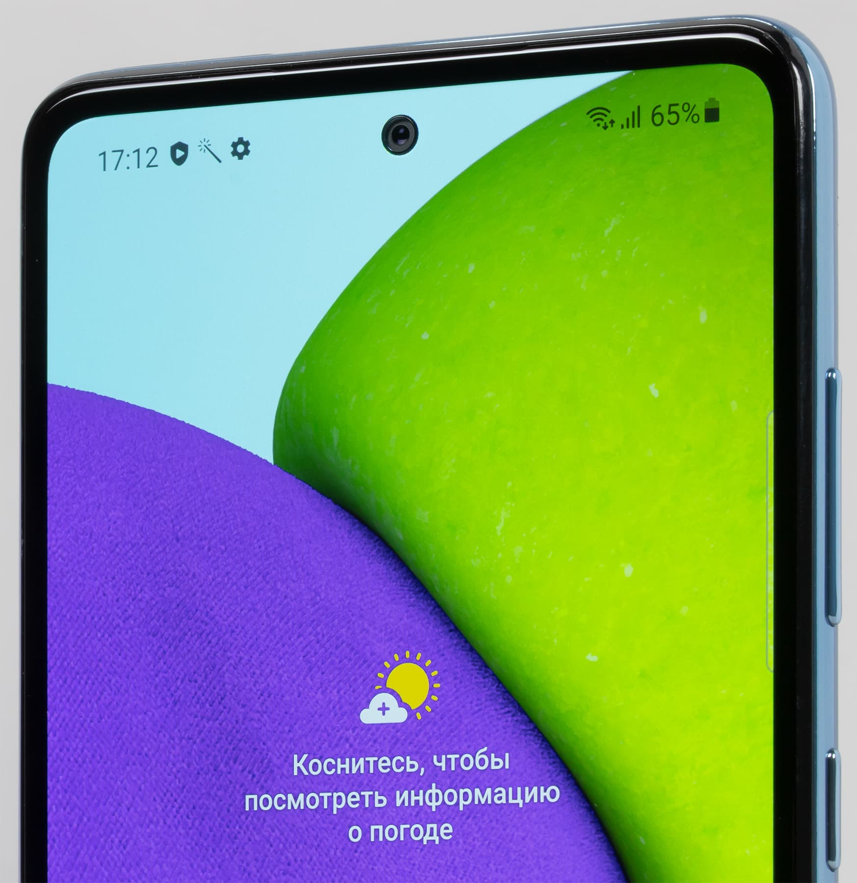 Смартфон Samsung Galaxy A52 оснащен AMOLED-дисплеем с диагональю 6,5 дюйма и разрешением 1080×2400, прикрытым плоским стеклом Corning Gorilla Glass 5. Физические размеры экрана составляют 68×150 мм, соотношение сторон — 20:9, плотность точек — 407 ppi. Ширина рамки вокруг экрана составляет по 3,5 мм с боков, 4,5 мм сверху и 5,5 мм снизу, так что рамка не из самых тонких.