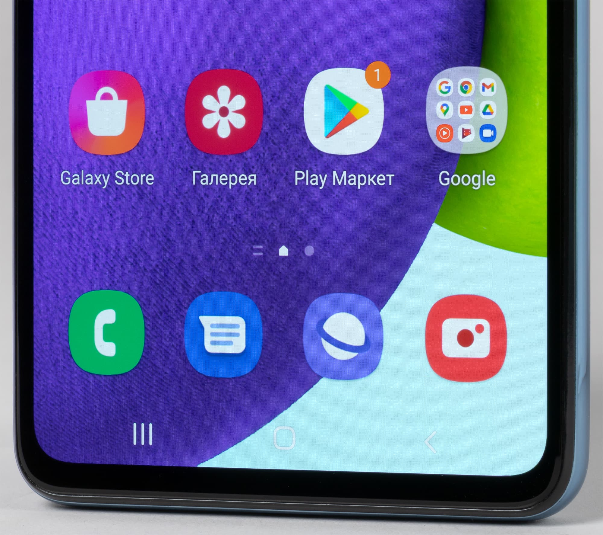 Экран у Samsung Galaxy A52 такой же темный (яркость по фотографиям 110 у обоих) и не имеет выраженного оттенка. Двоение отраженных объектов в экране Samsung Galaxy A52 очень слабое, это свидетельствует о том, что между слоями экрана нет воздушного промежутка. За счет меньшего числа границ (типа стекло/воздух) с сильно различающимися коэффициентами преломления экраны без воздушного промежутка лучше смотрятся в условиях интенсивной внешней засветки, но вот их ремонт в случае потрескавшегося внешнего стекла обходится гораздо дороже, так как менять приходится экран целиком. На внешней поверхности экрана Samsung Galaxy A52 есть специальное олеофобное (жироотталкивающее) покрытие (эффективное, гораздо лучше, чем у Nexus 7), поэтому следы от пальцев удаляются существенно легче, а появляются с меньшей скоростью, чем в случае обычного стекла.
