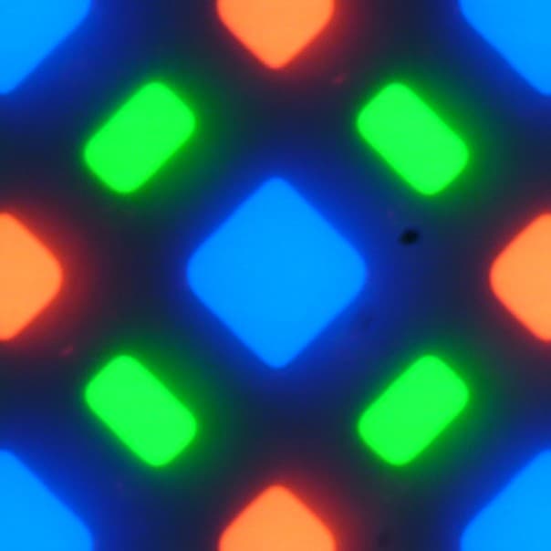 В этом экране используется матрица AMOLED — активная матрица на органических светодиодах. Полноцветное изображение создается с помощью субпикселей трех цветов — красного (R), зеленого (G) и синего (B), но красных и синих субпикселей в два раза меньше, что можно обозначить как RGBG. Это подтверждается фрагментом микрофотографии: