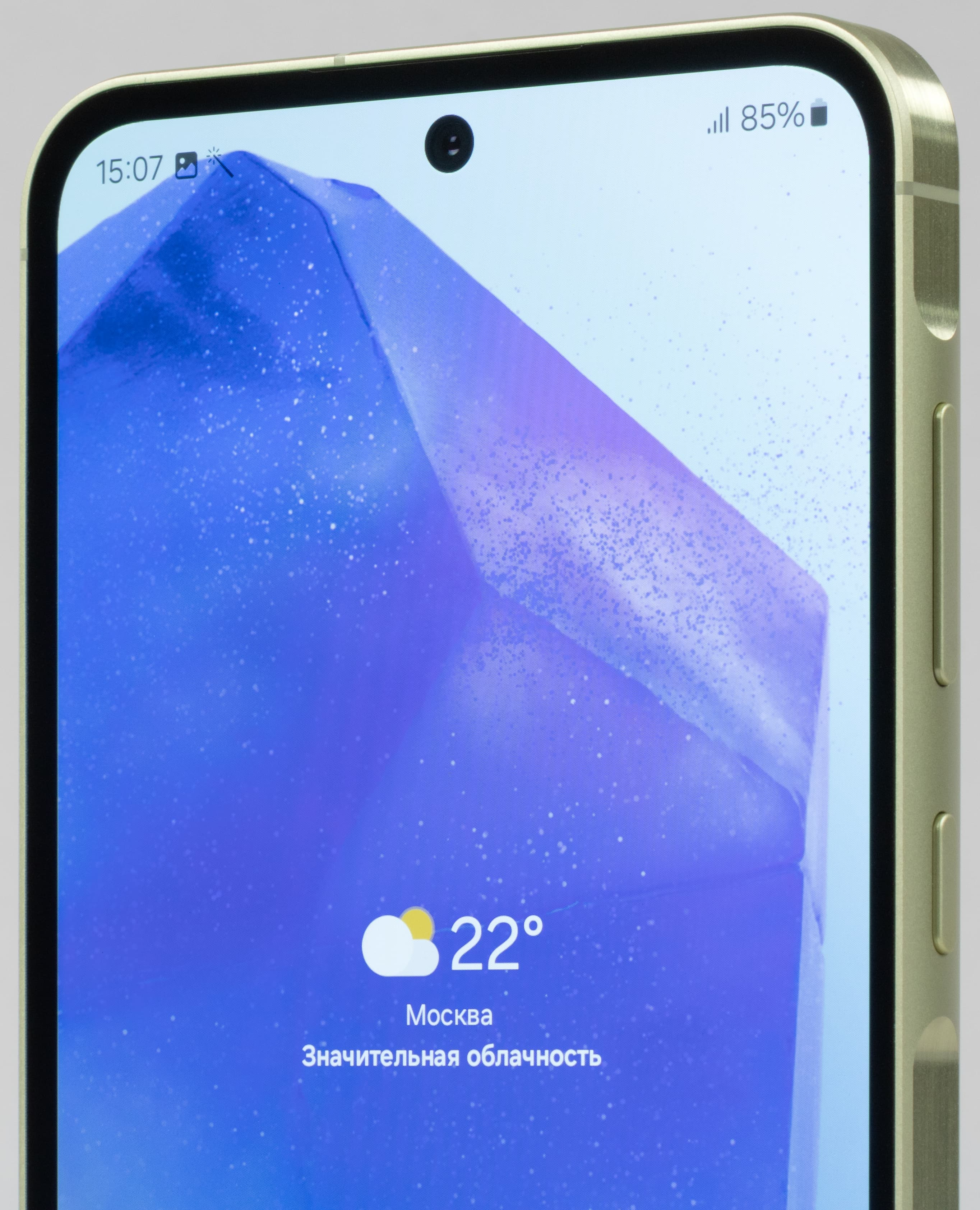 Одиночный глазок фронтальной камеры установлен за круглым вырезом в матрице экрана по центру верхней кромки.