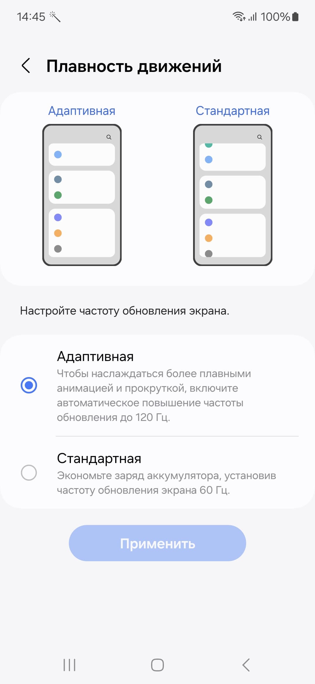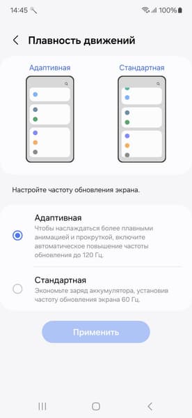В настройках экрана можно включить режим с повышенной до 120 Гц частотой обновления. В этом режиме нам как минимум обещают увеличение плавности прокрутки.