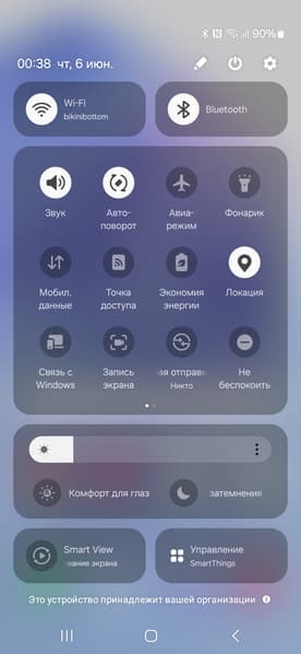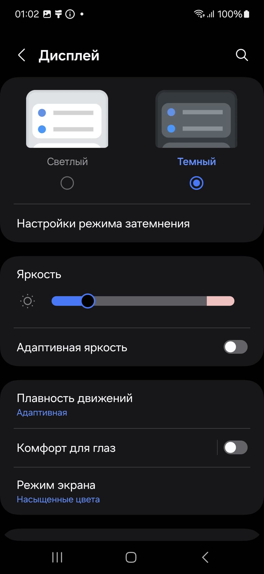 При выводе белого поля во весь экран и при ручном управлении яркостью ее максимальное значение составило порядка 410 кд/м², но на очень ярком свету и в случай автоматической регулировки яркости оно повышается до 940 кд/м² (в режиме HDR, то есть для HDR‑контента, максимальная яркость для белого поля почти во весь экран немного выше, а на 1% площади белого — 1740 кд/м²). Также нужно учитывать тот факт, что в данном случае чем меньше площадь белого на экране, тем он светлее, то есть фактическая максимальная яркость белых участков будет почти всегда выше указанного значения. В итоге, учитывая отличные антибликовые свойства, читаемость экрана днем на солнце должна быть на хорошем уровне, а темная тема не только экономит заряд аккумулятора, но способствует лучшей разборчивости информации на экране в условиях высокой освещенности. Минимальное значение яркости — 1,4 кд/м², то есть пониженный уровень яркости без проблем позволяет использовать устройство даже в полной темноте. Работает автоматическая регулировка яркости по датчику освещенности (он расположен под экраном близко к верхнему краю слева от фронтальной камеры). Работа этой функции зависит от положения ползунка регулировки яркости: им пользователь может попытаться выставить желаемый уровень яркости в текущих условиях. Если оставить все по умолчанию, то в полной темноте функция автояркости уменьшает яркость до 10 кд/м² (подходит), в условиях освещенного искусственным светом офиса (примерно 550 лк) устанавливает на 100 кд/м² (нормально), а условно под прямыми лучами солнца повышает до 940 кд/м² (до максимума, так и нужно). Результат нас устроил, но для пробы в полной темноте мы снизили яркость, получив в итоге для трех условий, указанных выше, следующие значения: 1,5, 110 и 940 кд/м² (что и требовалось). Получается, что функция автоподстройки яркости работает адекватно и в какой-то степени позволяет пользователю настраивать свою работу под индивидуальные требования.