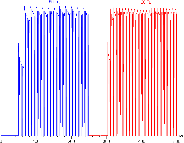 Действительно, в режиме 120 Гц плавность прокрутки повышается. Характер модуляции при этом не меняется.