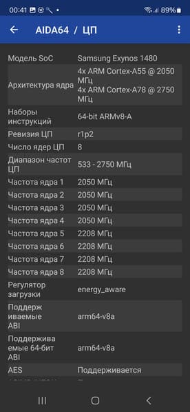 - SoC Samsung Exynos 1480, 8 процессорных ядер (4×Cortex-A78 @2750 МГц + 4×Cortex-A55 @2000 МГц)