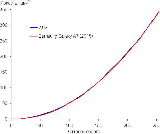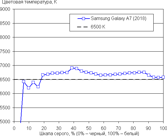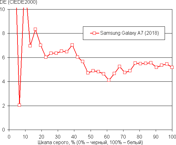 Напомним, что в случае OLED-экранов яркость фрагментов изображения динамично меняется в соответствии с характером выводимого изображения — уменьшается для светлых в целом изображений. В итоге полученная зависимость яркости от оттенка (гамма-кривая), скорее всего, немного не соответствует гамма-кривой статичного изображения, так как измерения проводились при последовательном выводе оттенков серого почти на весь экран.