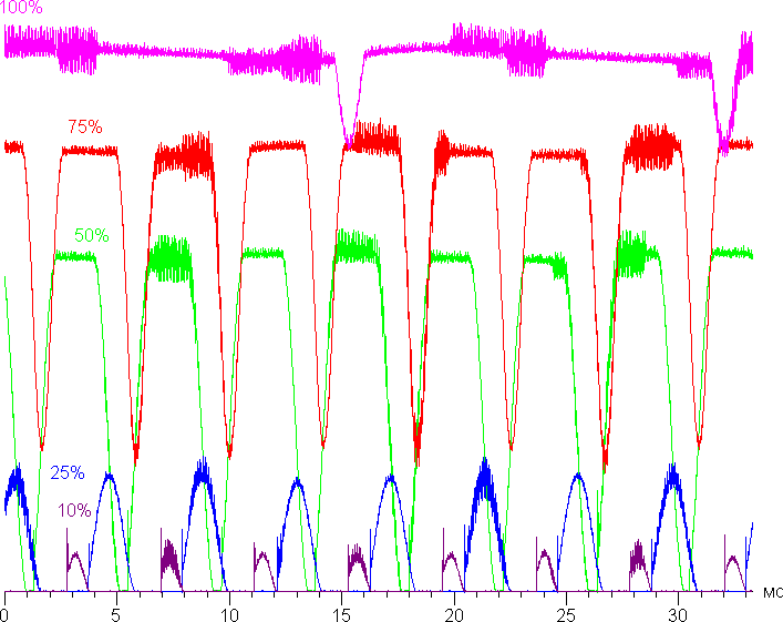 На любом уровне яркости присутствует значимая модуляция с частотой примерно 60 или 240 Гц. На рисунке ниже приведены зависимости яркости (вертикальная ось) от времени (горизонтальная ось) для нескольких значений настройки яркости:
