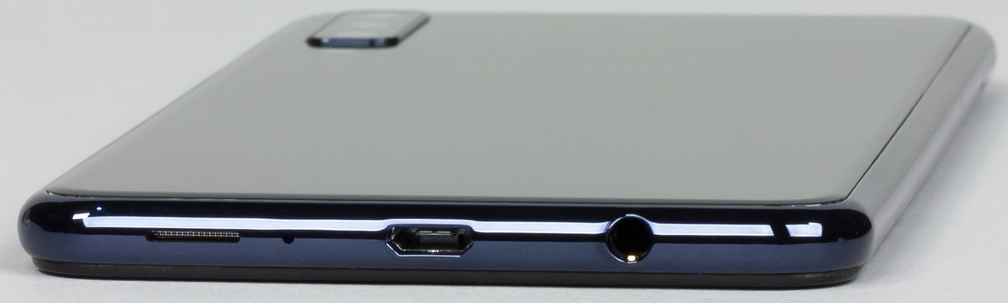 В нижнем торце порт USB представлен разъемом Micro-USB, хотя в Galaxy A9 стоит USB Type-C. Зато производитель сохранил здесь 3,5-миллиметровый выход на наушники (у A9 он, напомним, тоже есть), а также в нижний торец, выведены динамик, забранный металлической решеточкой, и разговорный микрофон.