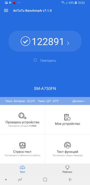А вот младшая модель Galaxy A7 (2018) и стоит гораздо меньше (27 тысяч на момент подготовки статьи), и при тестировании показала себя во всех отношениях сбалансированным и полностью оптимизированным устройством без «глюков», абсолютно стабильным в работе. Смартфон откровенно понравился: хотя он и не хватает звезд с небес, но свою цену полностью оправдывает. У него качественный AMOLED-экран, мощная и экономичная платформа, достойная автономность и вполне качественные для такой цены камеры. Звук не является сильной стороной смартфона, но это пожалуй, и всё. В итоге Samsung этой осенью предложила по вменяемой цене приятный во всех отношениях мобильный аппарат в своей обновленной линейке.