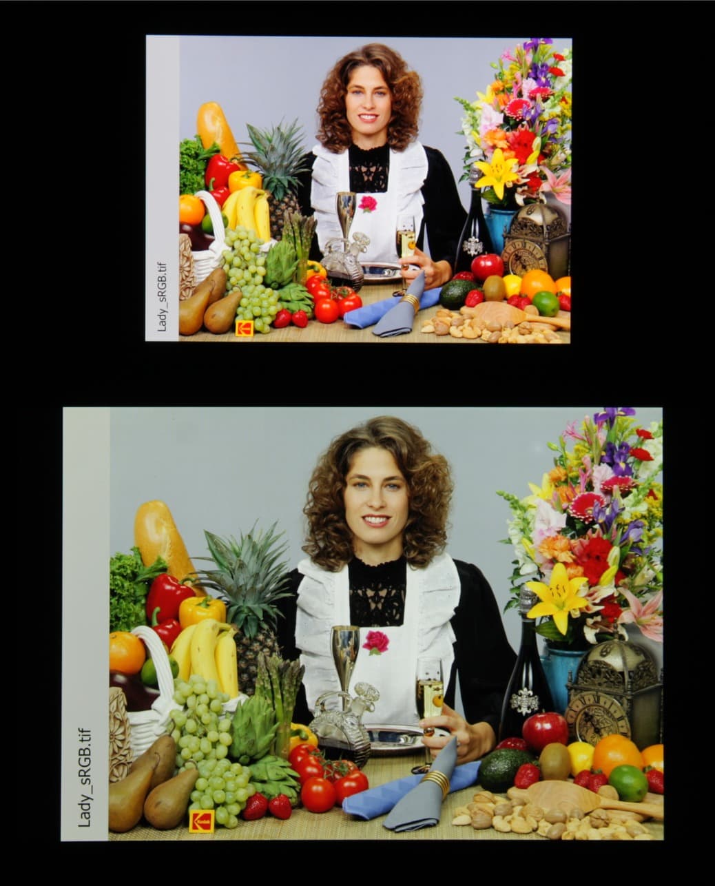 Отметим, что на экранах с широким цветовым охватом (без соответствующей коррекции) цвета́ обычных изображений, оптимизированных для устройств sRGB, выглядят неестественно насыщенными. Отсюда и рекомендация: в большинстве случаев смотреть кино, фотографии и все естественное лучше при выборе профиля Основной, и только если фотография сделана на установке Adobe RGB, имеет смысл переключить профиль на Фото AMOLED. Аналогично, профиль Фильм AMOLED уместен при просмотре видеоматериала с охватом DCI-P3, принятым в цифровом кинематографе.