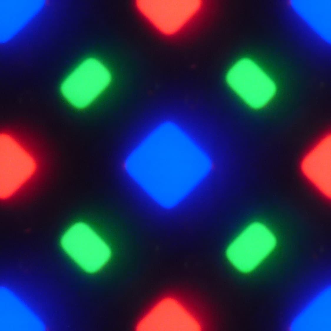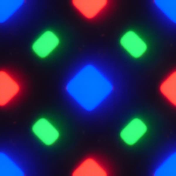 В этом экране используется матрица Super AMOLED — активная матрица на органических светодиодах. Полноцветное изображение создается с помощью субпикселей трех цветов — красного (R), зеленого (G) и синего (B), но красных и синих субпикселей в два раза меньше, что можно обозначить как RGBG. Это подтверждается фрагментом микрофотографии: