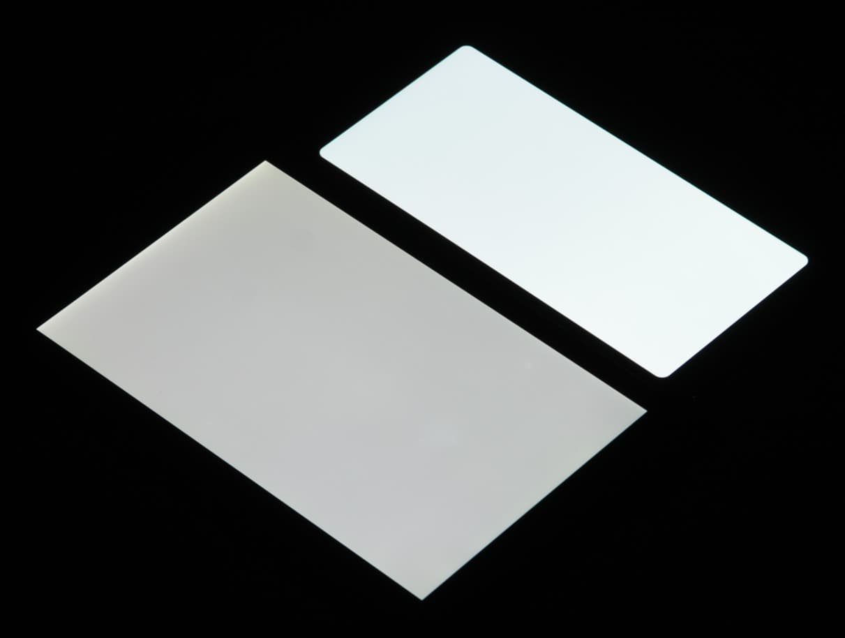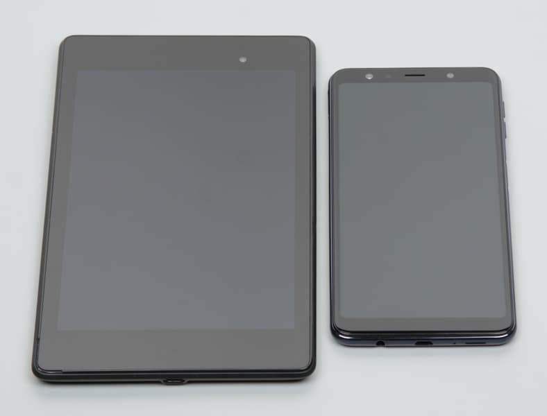 Лицевая поверхность экрана выполнена в виде стеклянной пластины с зеркально-гладкой поверхностью, устойчивой к появлению царапин. Судя по отражению объектов, антибликовые свойства экрана примерно как у экрана Google Nexus 7 (2013) (далее просто Nexus 7). Для наглядности приведем фотографию, на которой в выключенных экранах отражается белая поверхность (слева — Nexus 7, справа — Samsung Galaxy A7 (2018), далее их можно различать по размеру):