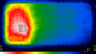 Нагрев локализован в верхней части аппарата, что, видимо, соответствует расположению микросхемы SoC. По данным теплокамеры, максимальный нагрев составил 39 градусов (при температуре окружающего воздуха в 24 градуса), это не очень много.