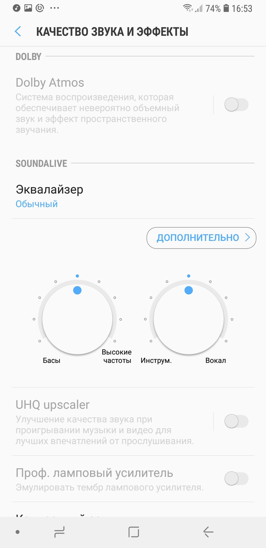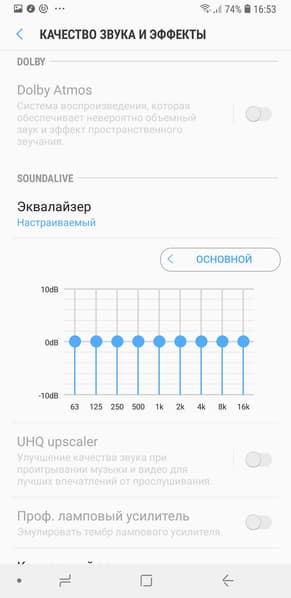 В плане звучания Samsung Galaxy A7 (2018) так же неинтересен, как и Galaxy A9 (2018). И в наушниках, и через громкоговоритель звук не насыщенный, не яркий, простенький и не очень громкий, хотя вполне чистый. Есть возможность ручных регулировок и пятиполосный эквалайзер с пресетами, есть поддержка Dolby Atmos, но все подключенные дополнительные эффекты делают звук более глухим.