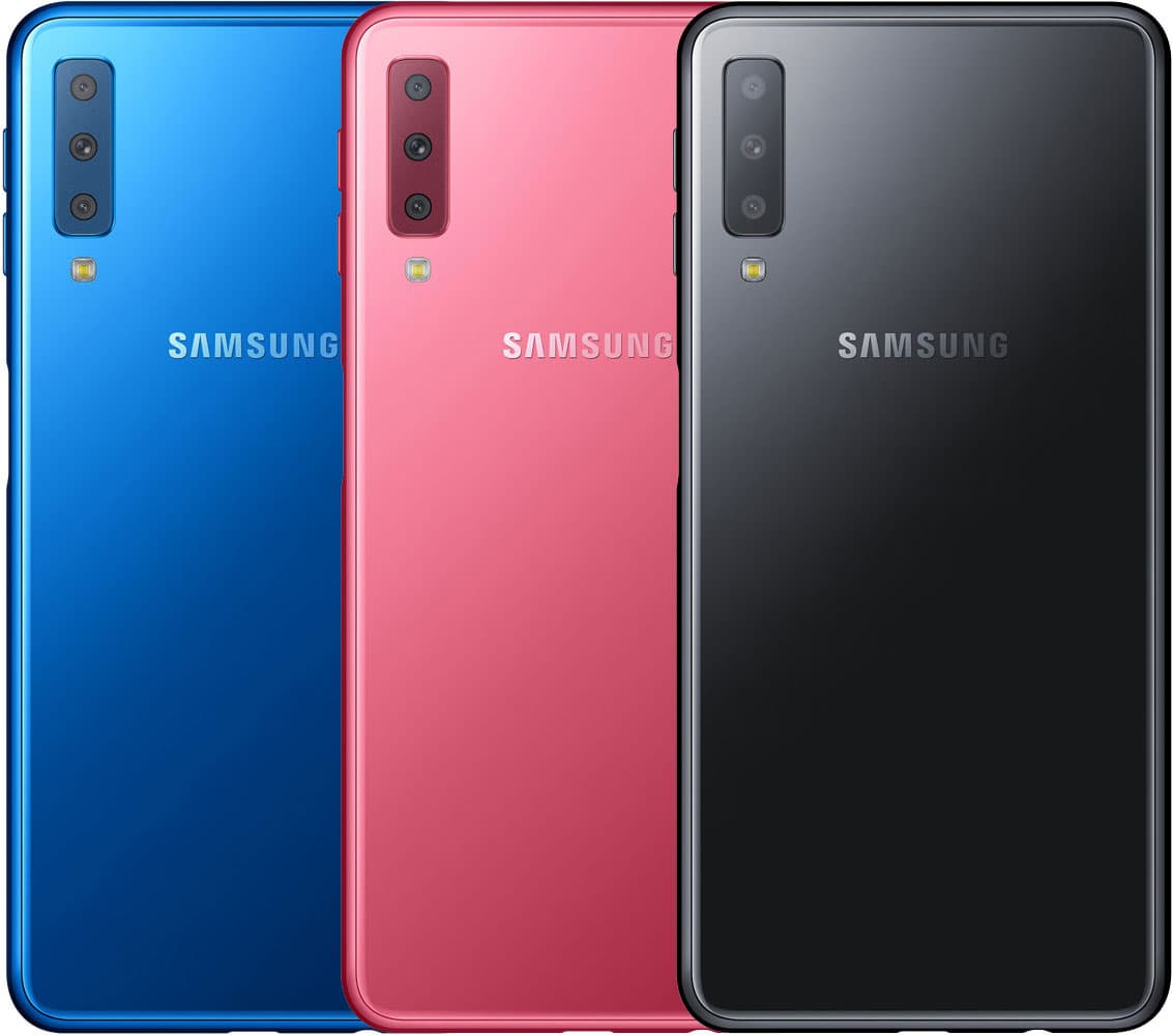 Samsung Galaxy A7 (2018) поступает в продажу в трех цветовых исполнениях: черном, розовом и голубом — здесь никаких отличий от старшей модели Samsung Galaxy A9 (2018). Передняя панель не окрашивается в цвет корпуса, она всегда черная. Защиты от воды корпус не имеет.