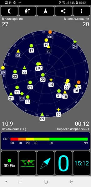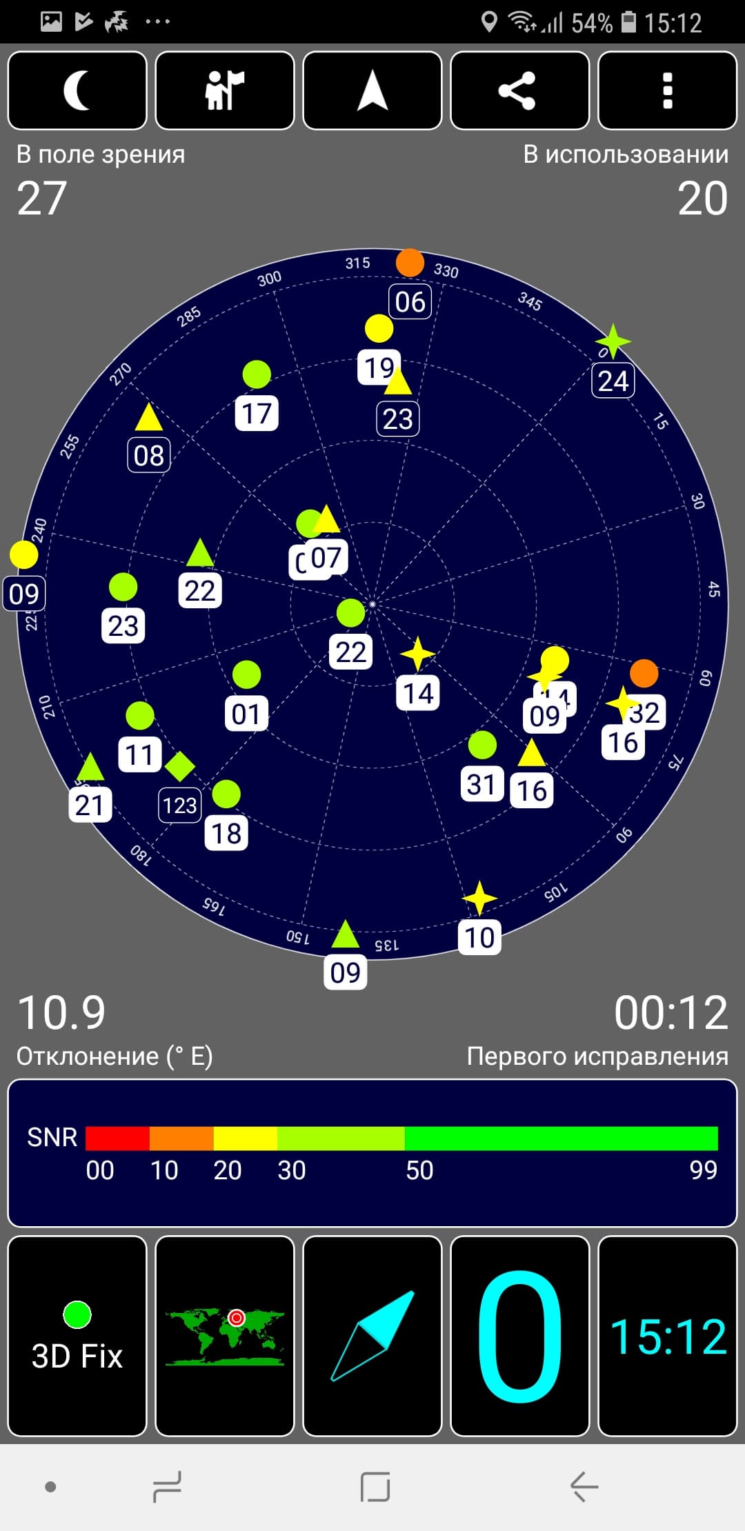 Навигационный модуль работает с GPS (с A-GPS) и с отечественной Глонасс. Первые спутники при холодном старте обнаруживаются в течение первых десятков секунд. Магнитный компас, необходимый для работы навигационных программ, в аппарате имеется.
