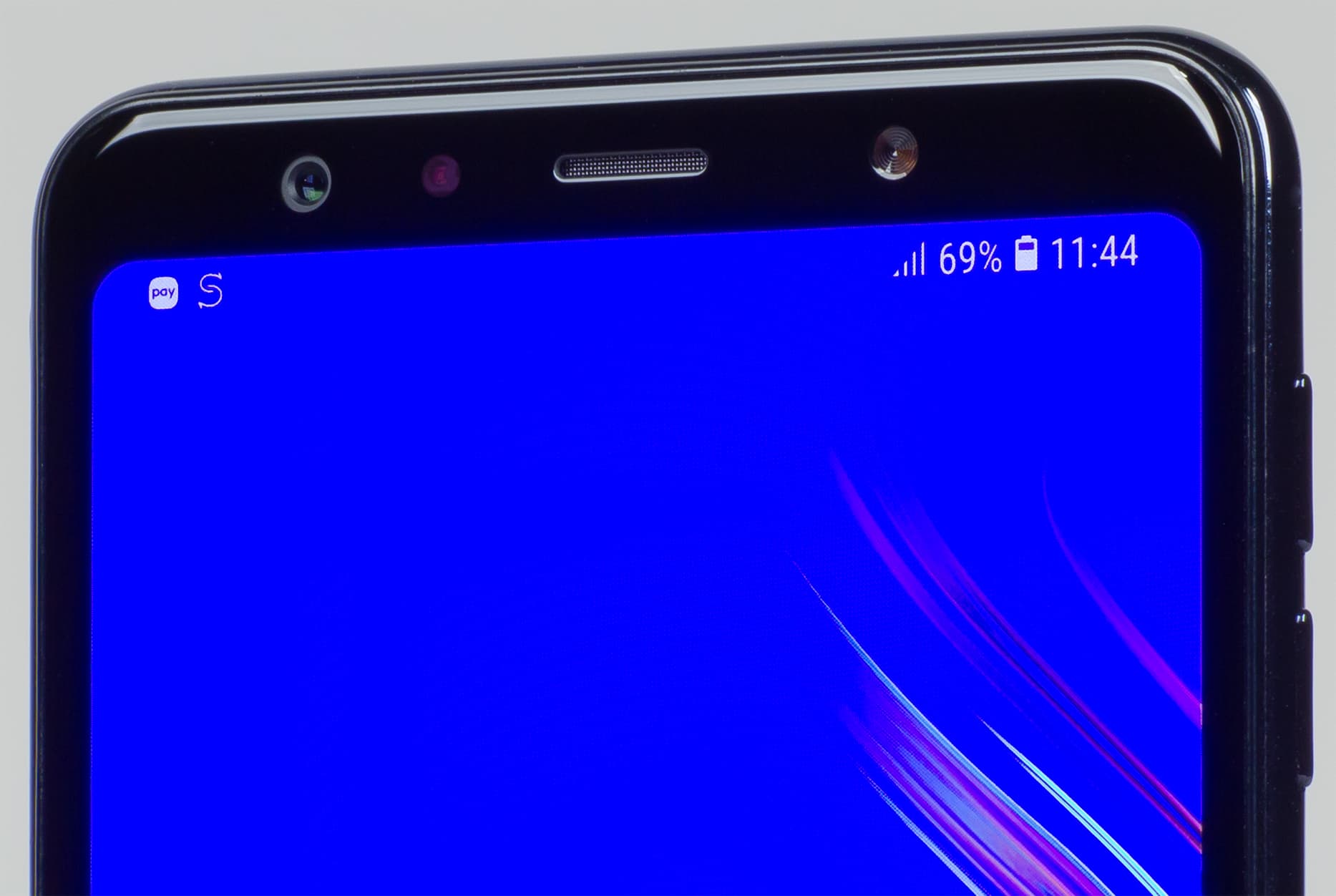 Samsung Galaxy A7 (2018) оснащен дисплеем Super AMOLED с защитным 2.5D-стеклом. Размеры экрана составляют примерно 67×138 мм при диагонали 6 дюймов, разрешение — 2220×1080 (соотношение сторон 18,5:9), что дает плотность точек около 411 ppi. Рамка вокруг экрана широкая: ширина с боков составляет не менее 4,5 мм, а отступы снизу и сверху — примерно по 10 мм.