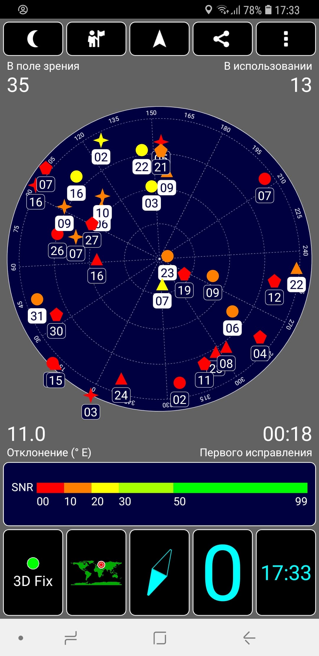 Навигационный модуль работает с GPS (с A-GPS) и с отечественной Глонасс. Первые спутники при холодном старте обнаруживаются в течение первой минуты. Магнитный компас, необходимый для работы навигационных программ, в аппарате имеется.