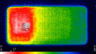 Нагрев локализован в верхней части аппарата, что, видимо, соответствует расположению микросхемы SoC. По данным теплокамеры, максимальный нагрев составил 41 градус (при температуре окружающего воздуха в 24 градуса), это средний нагрев.