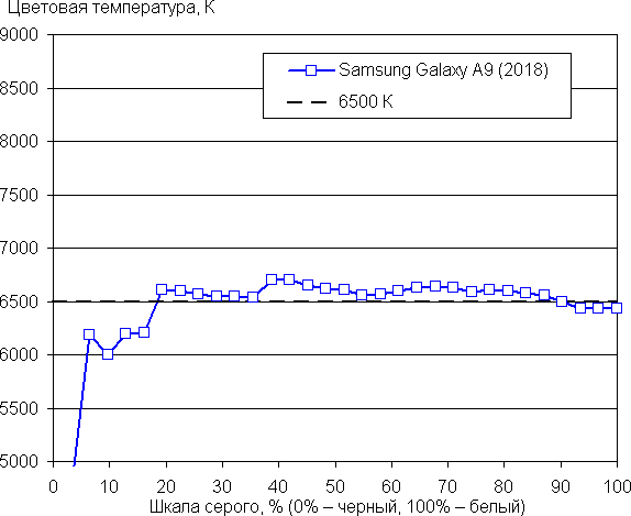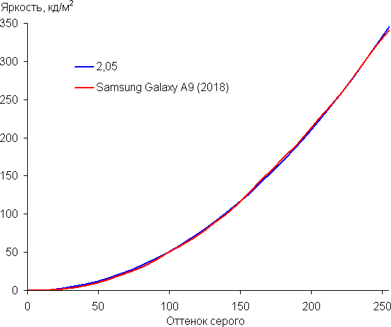 Напомним, что в случае OLED-экранов яркость фрагментов изображения динамично меняется в соответствии с характером выводимого изображения — уменьшается для светлых в целом изображений. В итоге полученная зависимость яркости от оттенка (гамма-кривая), скорее всего, немного не соответствует гамма-кривой статичного изображения, так как измерения проводились при последовательном выводе оттенков серого почти на весь экран.