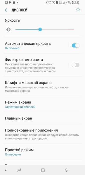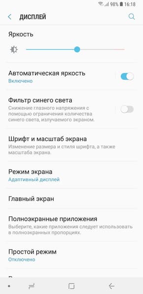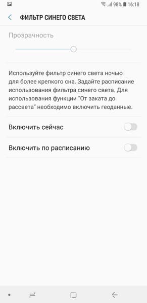 Есть модная нынче функция Фильтр синего света, для которой в настройках даже приведено белее-менее корректное описание (в меню уровня выше написано про «снижение глазного напряжения» — ну, хоть про ультрафиолет нет фантазий):