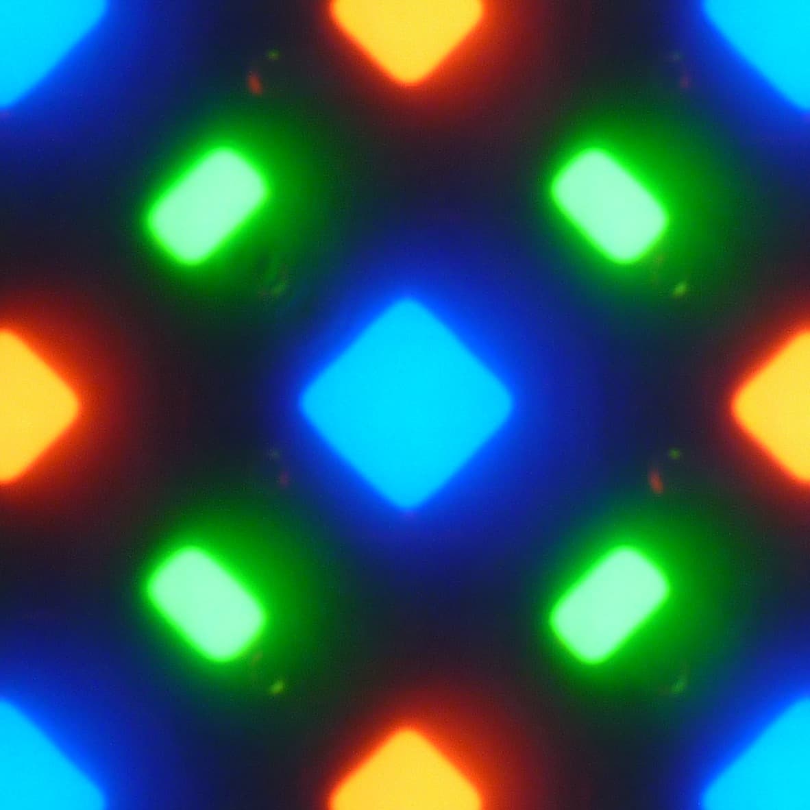 На фрагменте выше можно насчитать 4 зеленых субпикселя, 2 красных (4 половинки) и 2 синих (1 целый и 4 четвертушки), при этом, повторяя эти фрагменты, можно выложить весь экран без разрывов и перехлеста. Для таких матриц компания Samsung ввела наименование PenTile RGBG. Разрешение экрана производитель считает по зеленым субпикселям, по двум другим оно будет в два раза ниже. Разумеется, присутствуют некоторая неровность контрастных границ и другие артефакты изображения, характерные для экранов PenTile. Впрочем, из-за высокого разрешения они лишь минимально сказываются на качестве картинки.