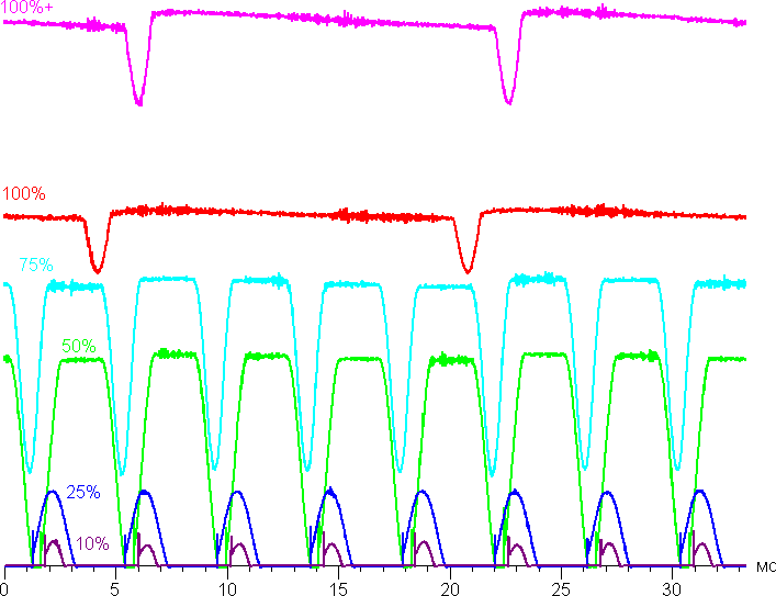 На любом уровне яркости присутствует значимая модуляция с частотой примерно 60 или 240 Гц. На рисунке ниже приведены зависимости яркости (вертикальная ось) от времени (горизонтальная ось) для нескольких значений настройки яркости: