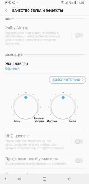 В плане звучания Samsung Galaxy A9 (2018) не очень интересен: и в наушниках и через громкоговоритель звук не насыщенный, не яркий, простенький и не очень громкий, хотя достаточно чистый. Есть возможность ручных регулировок и пятиполосный эквалайзер с пресетами, есть поддержка Dolby Atmos, но все включенные дополнительные эффекты делают максимальный уровень громкости еще ниже, а сам звук — более глухим.