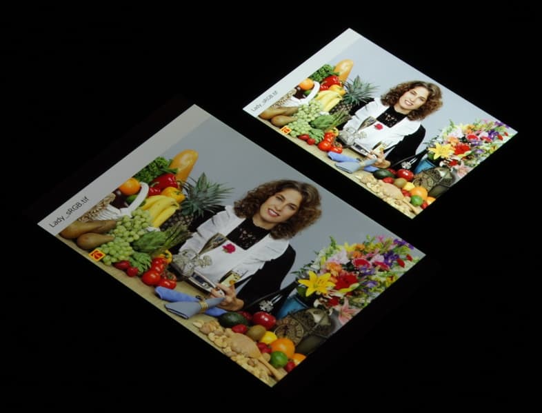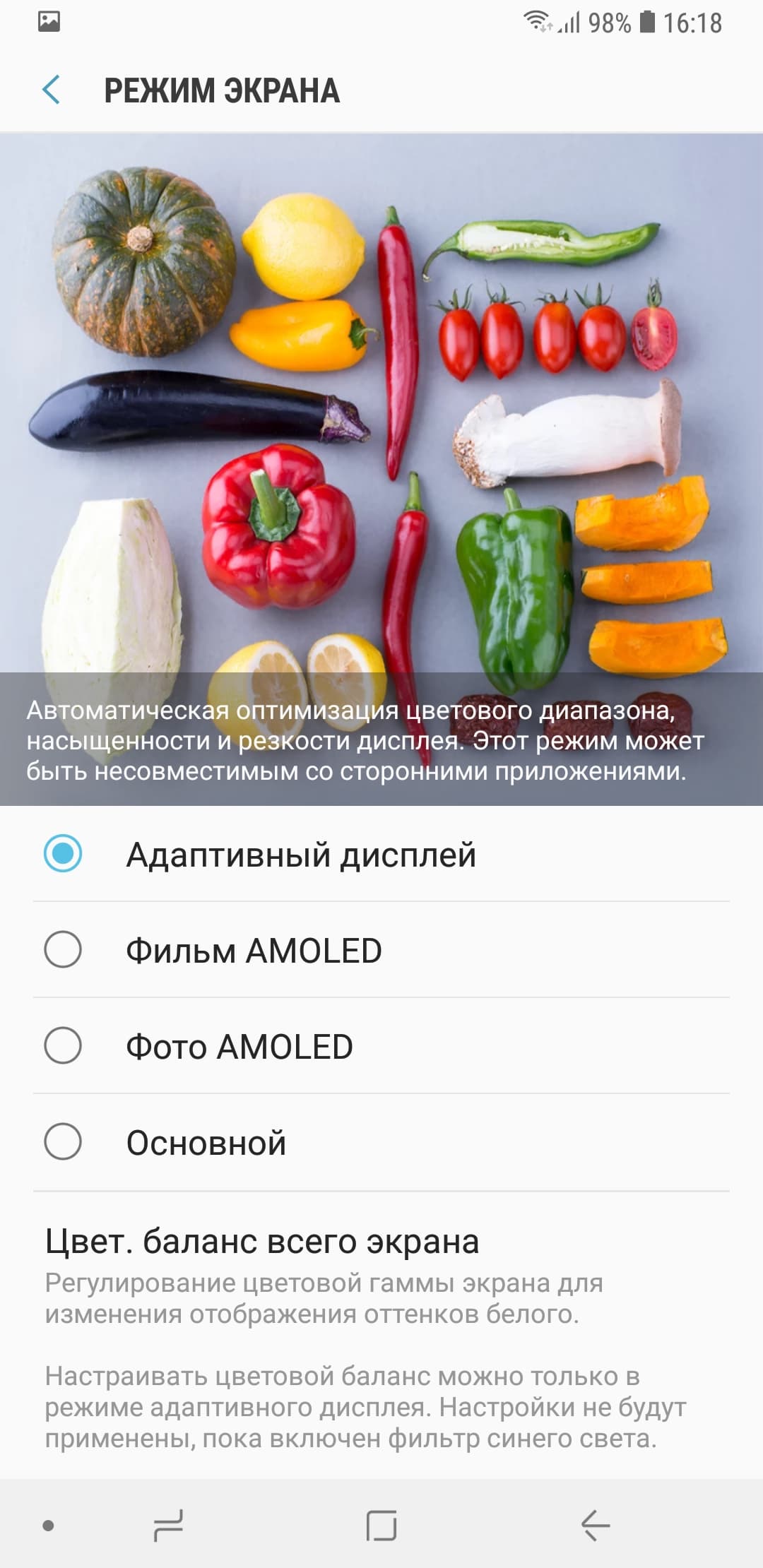 Отметим, что на экранах с широким цветовым охватом (без соответствующей коррекции) цвета́ обычных изображений, оптимизированных для устройств sRGB, выглядят неестественно насыщенными. Отсюда и рекомендация: в большинстве случаев смотреть кино, фотографии и все естественное лучше при выборе профиля Основной, и только если фотография сделана на установке Adobe RGB, имеет смысл переключить профиль на Фото AMOLED. Аналогично, профиль Фильм AMOLED уместен при просмотре видеоматериала с охватом DCI-P3, принятым в цифровом кинематографе.