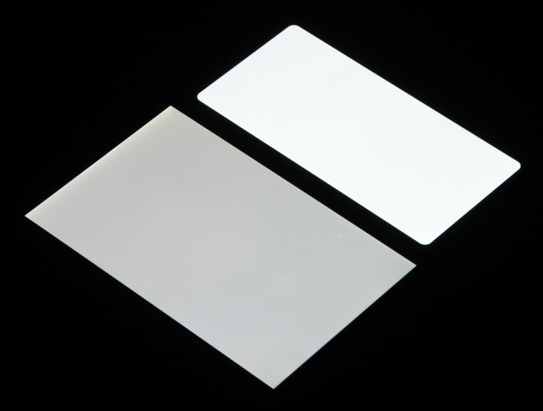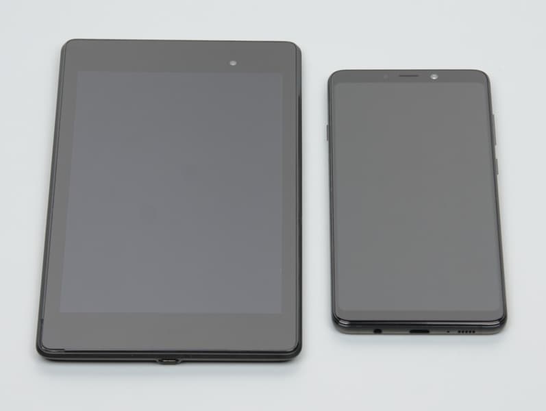 Лицевая поверхность экрана выполнена в виде стеклянной пластины с зеркально-гладкой поверхностью, устойчивой к появлению царапин. Судя по отражению объектов, антибликовые свойства экрана примерно как у экрана Google Nexus 7 (2013) (далее просто Nexus 7). Для наглядности приведем фотографию, на которой в выключенных экранах отражается белая поверхность (слева — Nexus 7, справа — Samsung Galaxy A9 (2018), далее их можно различать по размеру):