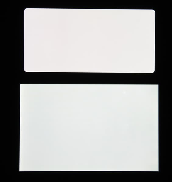 Яркость под углом у обоих экранов заметно уменьшилась (чтобы избежать сильного затемнения, выдержка увеличена в сравнении с предыдущими фотографиями), но в случае тестируемого смартфона падение яркости выражено гораздо меньше. В итоге при формально одинаковой яркости экран Samsung Galaxy A9 (2018) визуально выглядит гораздо более ярким (в сравнении с ЖК-экранами), так как на экран мобильного устройства часто приходится смотреть как минимум под небольшим углом.
