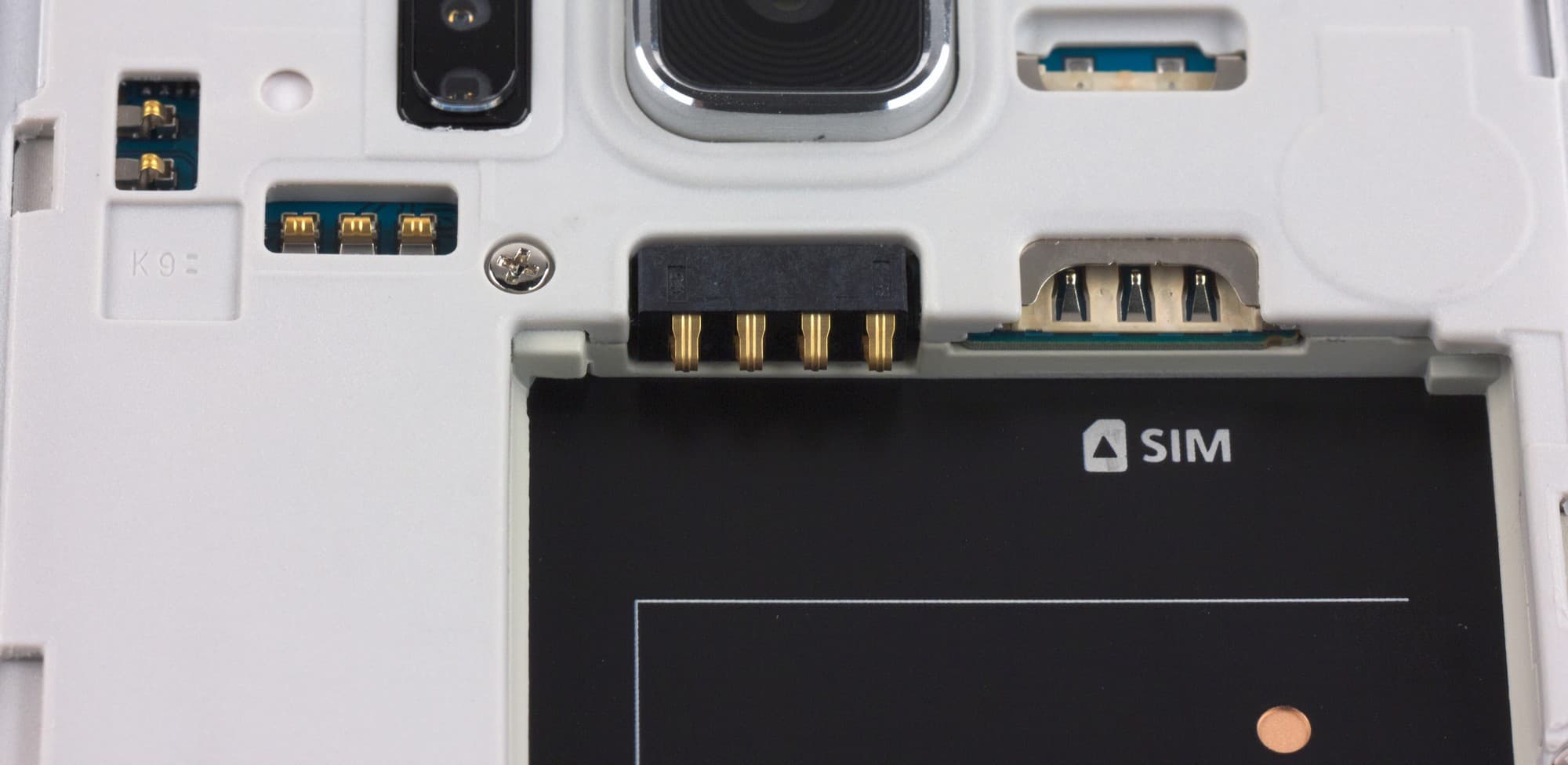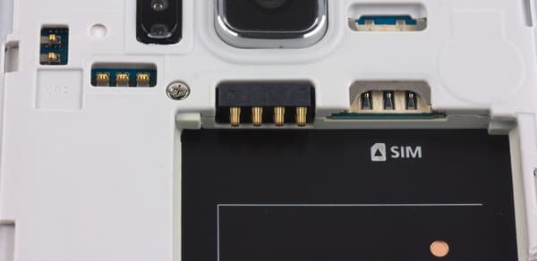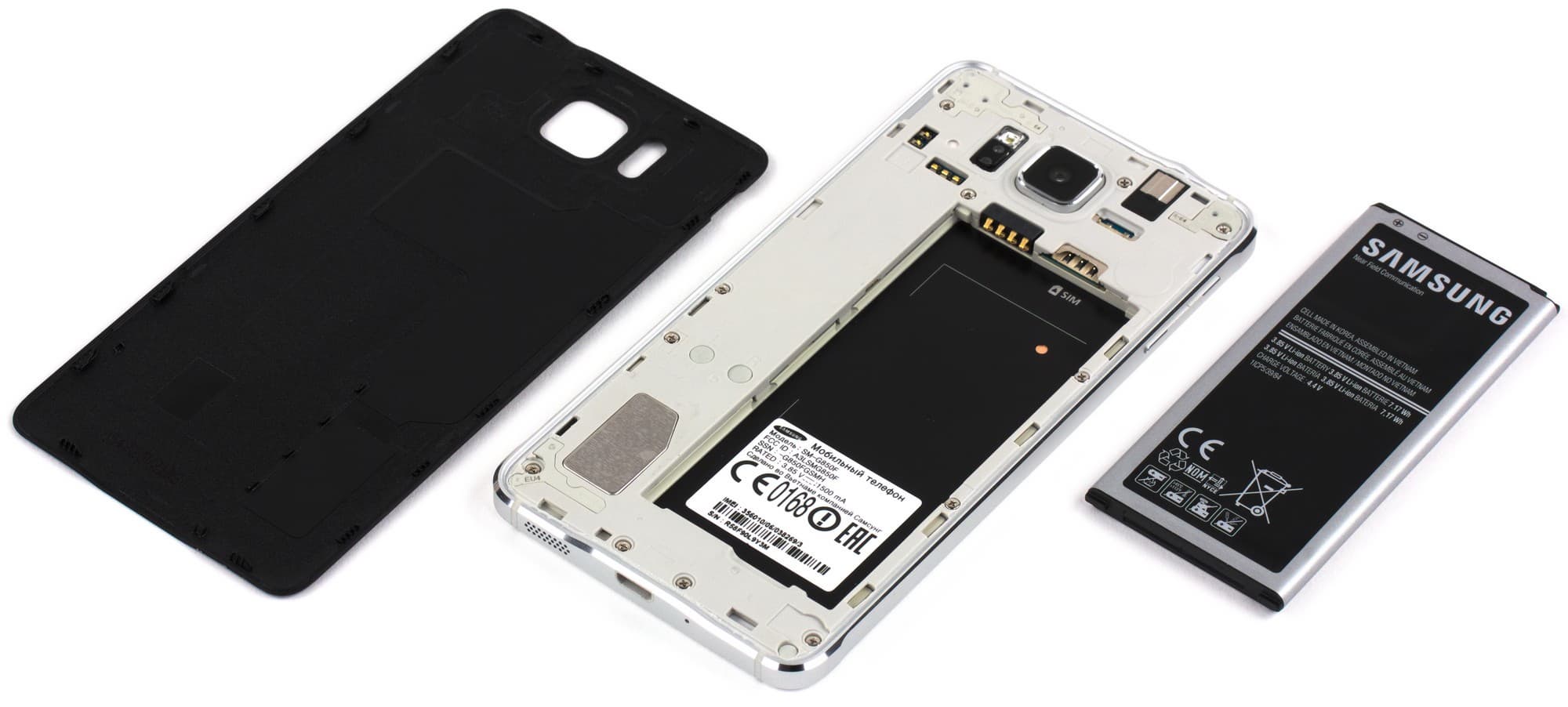 Задняя крышка у смартфона, как и прежде, является съемным элементом, так что способ установки карточек привычен для таких случаев: SIM-карта вставляется в слот, спрятанный под крышкой, и подпирается снизу аккумуляторной батареей. Сама батарея съемная, имеет такую же сильно вытянутую прямоугольную форму, как и в Galaxy Note 4, только в размерах существенно меньше. SIM-карту невозможно вынуть, не извлекая аккумулятор, для удобства выдвижения карточки сверху предусмотрена прорезь, сквозь которую можно ее протолкнуть к выходу. Слота для карт памяти в Samsung Galaxy Alpha нет.