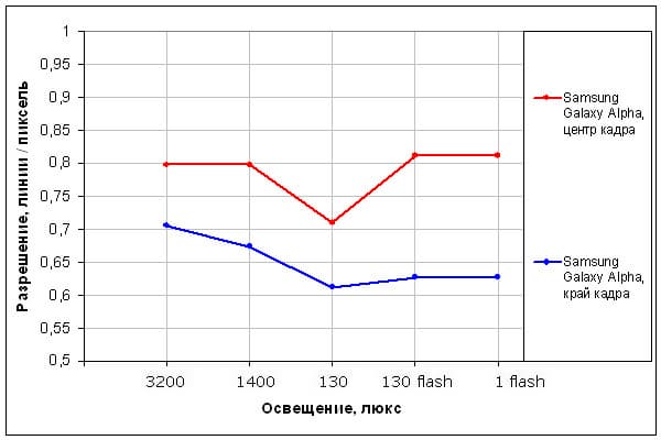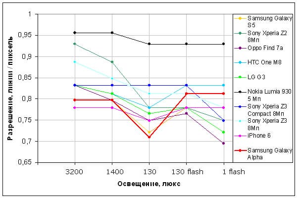 На графиках видно, что по разрешению Alpha держится почти на уровне своих, пожалуй, основных конкурентов — Xperia Z3 Compact и iPhone 6, заметно уступая им только при плохом освещении. Но этот недостаток камера компенсирует мощной, хотя и довольно узкой вспышкой. Тем не менее, съемкой при плохом освещении злоупотреблять не стоит, а при хорошем камера вполне способна выдать отличный результат.
