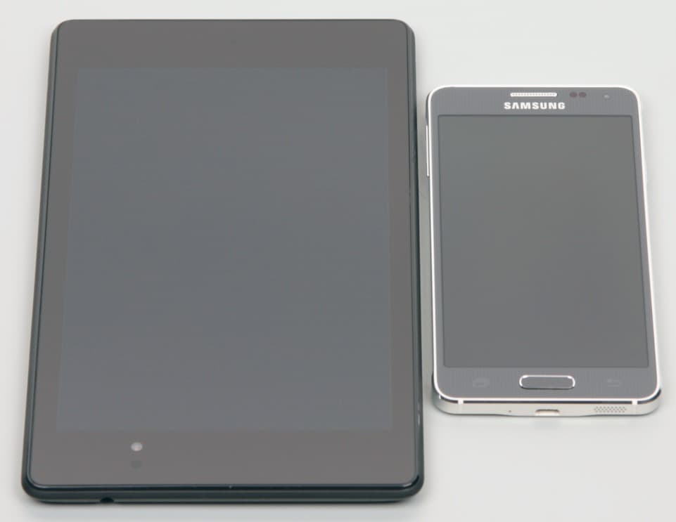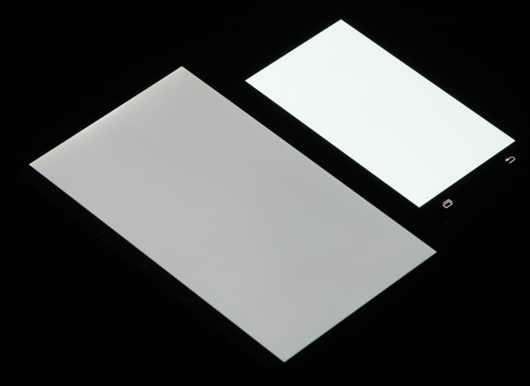 Лицевая поверхность экрана выполнена в виде стеклянной пластины с зеркально-гладкой поверхностью, устойчивой к появлению царапин. Судя по отражению объектов, антибликовые свойства экрана может чуть хуже, чем у экрана Google Nexus 7 (2013) (далее просто Nexus 7). Для наглядности приведем фотографию, на которой в выключенных экранах отражается белая поверхность (слева — Nexus 7, справа — Samsung Galaxy Alpha, далее их можно различать по размеру):