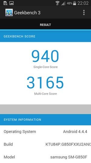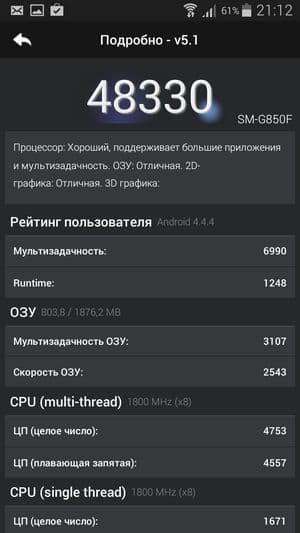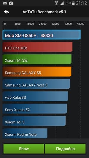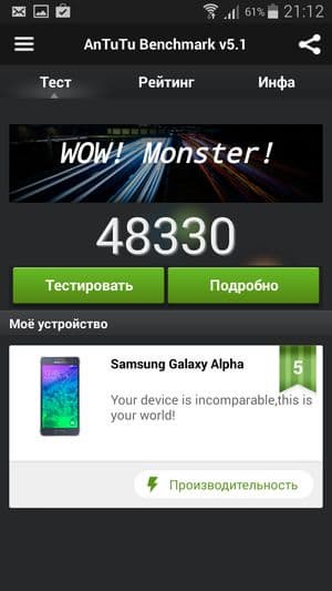 В тесте AnTuTu смартфон демонстрирует очень высокие показатели, но тут стоит учитывать, что теперь используется новая, пятая версия популярного бенчмарка, в ней результирующие цифры сильно увеличились, так что напрямую сравнивать результаты новинки с результатами большинства прошлогодних моделей уже нельзя. (Мы будем помечать в табличках, какими версиями бенчмарка тестировалась та или иная модель, пока для сравнения вновь не наберется достаточно моделей, протестированных в пятой версии теста.) Впрочем, в данном случае подобранные для сравнения конкуренты также уже успели пройти тестирование в пятой версии AnTuTu, и среди них герой сегодняшнего обзора все равно оказался в лидерах. В любом случае смартфон Samsung Galaxy Alpha — это максимально мощный и производительный на текущий момент мобильный аппарат, мощности которого еще долго будет хватать для выполнения любых поставленных задач. Забегая вперед можно заметить, что и в плане автономности Samsung Galaxy Alpha демонстрирует неожиданно неплохие результаты, несмотря на достаточно небольшой объем установленной в нем аккумуляторной батареи.